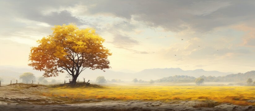 In the peaceful countryside, on a calm autumn day, the branches of nature's vibrant fall colors stretched out horizontally against the serene backdrop of the outdoor, with no sign of anybody in sight