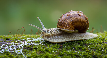 Slow gastropod snail with a brown spiral shell and slimy white body crawling on a green leaf, macro nature closeup