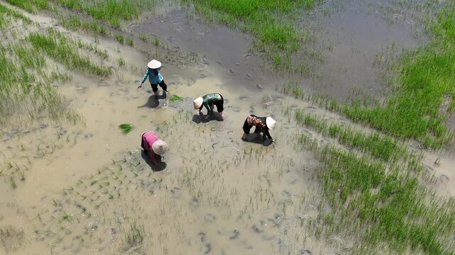A series of drone clips showing farmers wearing conical hats and transplanting rice seedlings by hand in a muddy rice paddy in Vietnam. The footage captures this traditional agricultural practice.