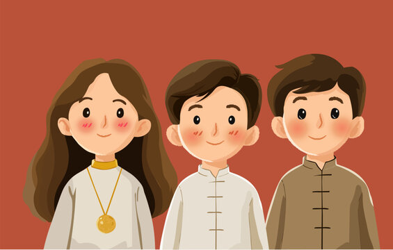 Cute Chibi Characters in Vietnamese Traditional Clothing for Lunar New Year Celebration.
