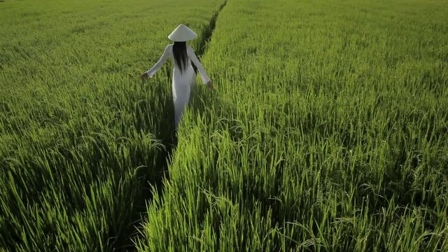 Young Woman Wearing Ao Dai Standing in Rice Paddy Vietnam