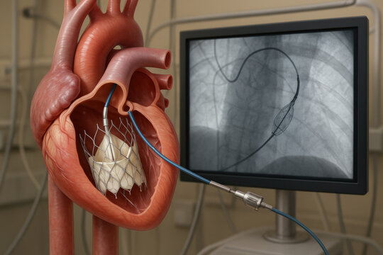 Heart valve replacement illustration, minimally invasive transcatheter aortic valve implantation (TAVI) procedure [Illustration]