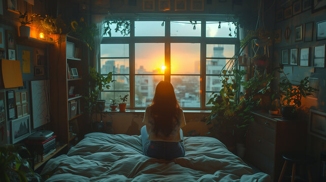 beautiful morning alone woman wake up in a cozy apartman ful of green houseplant for the firs rays of orange morning sun