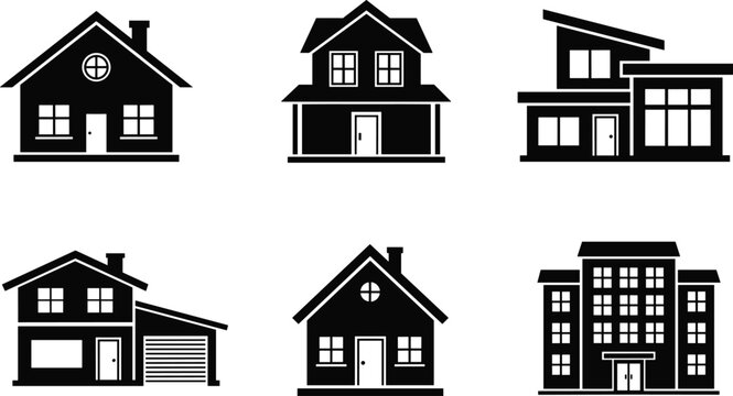 Real estate house and apartment building silhouette icon set for residential architecture design vector illustration.