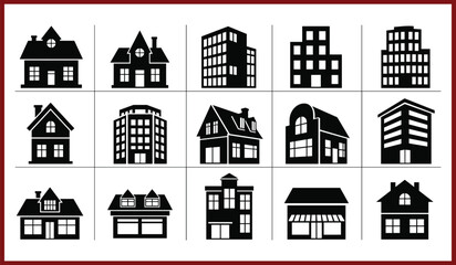 Vector city and building icon set. Urban architecture line icons. Real estate, property, construction symbols. Skyscraper, house, office, and apartment block pictogram collection.