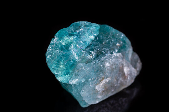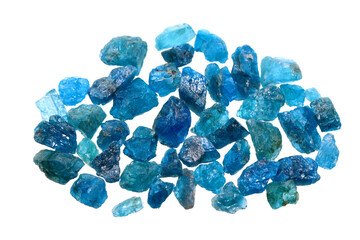 Macro shoot of piece of raw uncut Blue Apatite Mineral stone isolated on white background. Closeup photo of amazing natural turquoise specimen mineral rough.