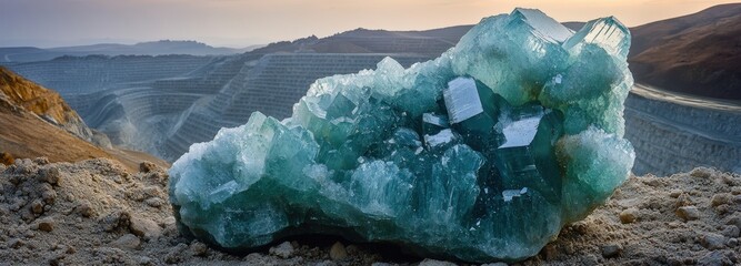 Large jagged raw apatite crystal with translucent hues in mining quarry at twilight