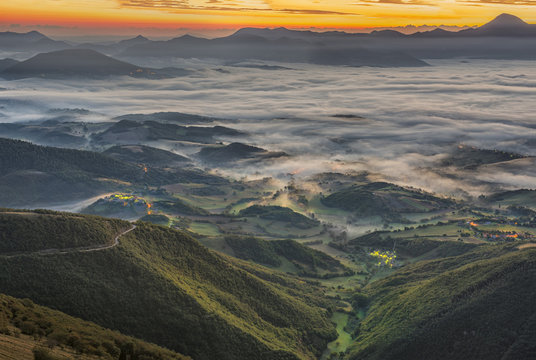 Italy, Marche, Apennines, aerial view of valleys with fog at sunrise