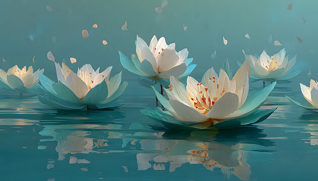 the image depicts a peaceful atmosphere of floating aper lotus flowers on calmwater accompanied by gentl ripples and a soft teal bckground representing sereity and peace