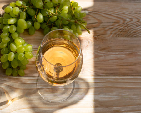 White Wine Glass on Ripe Green Grapes Background in Sunny Day