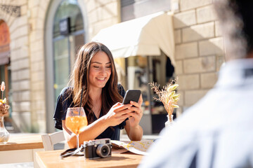 Smiling woman using mobile phone while sitting at sidewalk cafe