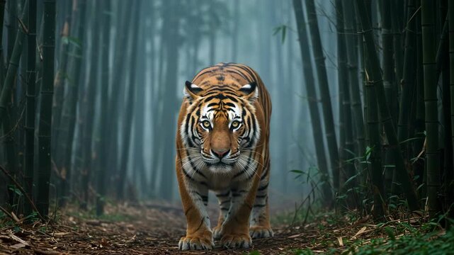 A powerful tiger walking through a misty jungle surrounded by dense greenery captures the wild essence of nature's apex predator.