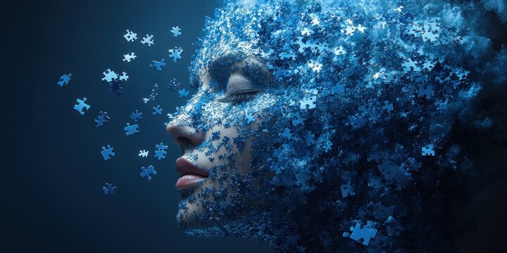 Elderly woman lost pieces of his head like Dandelion seeds in the wind. Dementia Alzheimer, memory loss and losing part of brain concept. Elderly woman. Female subject. Vector illustration