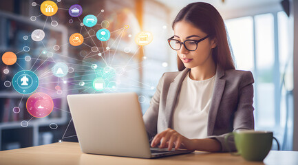 Businesswoman using a laptop computer and with a cup of coffee on the table. Modern concept of technology and networking. Software development tool. API application programming interface. Help of AI