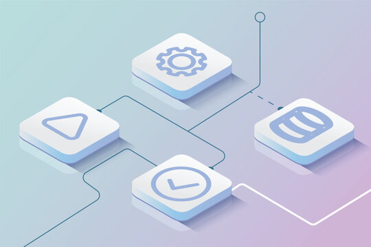 Isometric Workflow Icons, Cyan Gradient Vector Diagram, Data Integration and UI/UX, Digital interface showing app icons connected in process workflow, technology integration and automation system