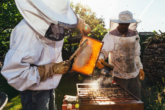 Honey harvest. Beekeeper collecting honey from hive frames