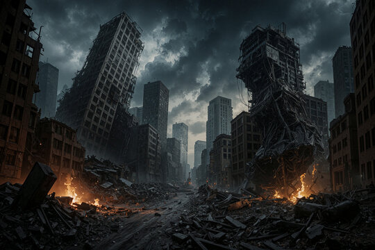 An apocalyptic vision of the Earth post-nuclear war with cities in ruins under a dark stormy sky and ashen rain falling