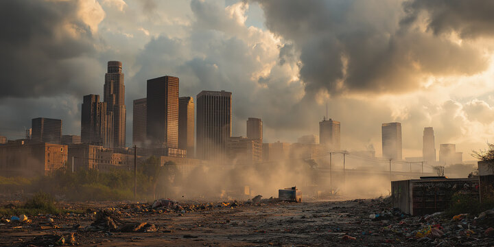 Abandoned city skyline with smoke and debris under golden smoggy skies at sunset