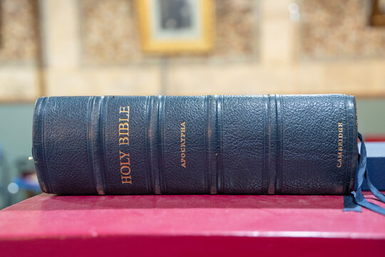 crimson, black leather, vintage, gold inscription, lectern, Holy Bible, Vintage black leather Holy Bible with Apocrypha inscribed in gold displayed on a crimson lectern