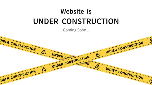 Website in under construction banner. Web page building image with text and yellow tape. Modern vector on transparent background.