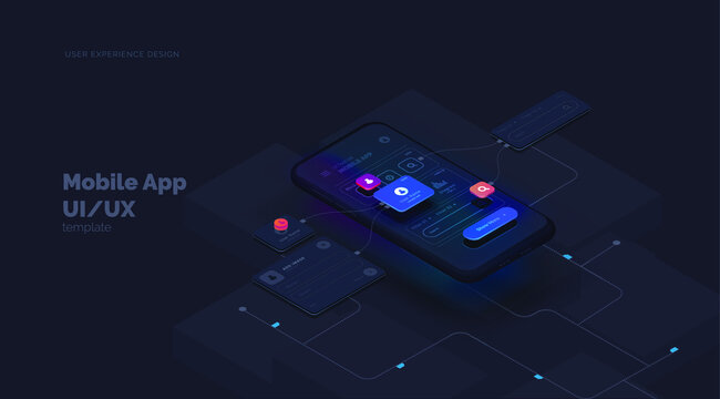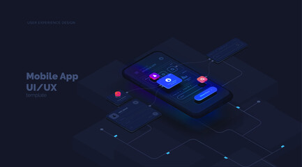 User experience. Smartphone mockup on black background with interactive user interface. The process of creating a mobile application. Website wireframe for mobile apps with active layers and links