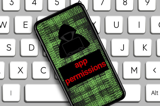app permission word and Hacker icon in mobile phone with digital code numbers.