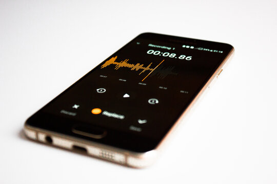 Voice recorder on a smartphone. Voice recording wave on the screen of a smartphone. Recording sounds on a smartphone. Voice recorder noise level wave.