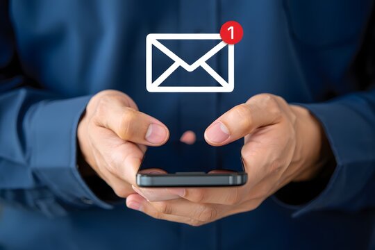 Businessman hand holding use smartphone with new email alert sign icon pop up to send or read email. Communication business technology concept. connection message to global letters. receive newsletter