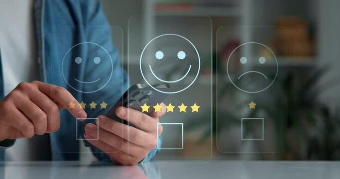Close-up of hands and smartphone, evaluation of the quality of service,store,service,services in network and social networks. Rating assessment and customer service satisfaction. Feedback rating app