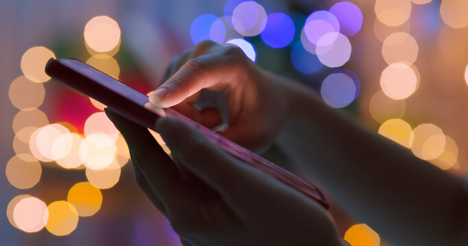 Woman use of mobile phone and lying on bed at night