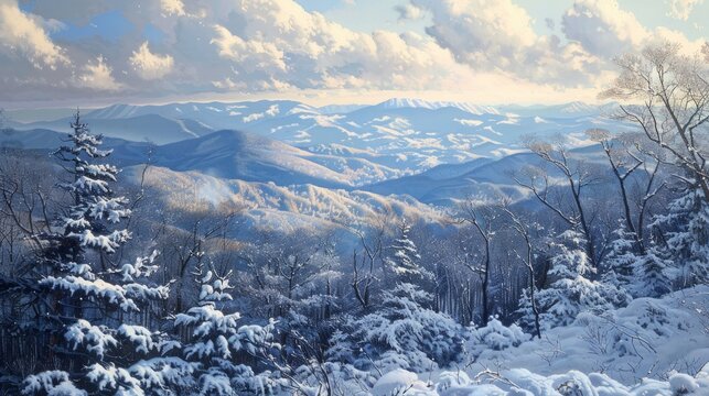 A picturesque view of the Blue Ridge Mountains covered in snow.