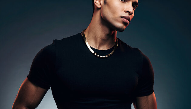 Stylish young adult male in a plain black t-shirt with a gold chain, perfect for a modern apparel mockup design template, showcasing contemporary fashion and masculine appeal