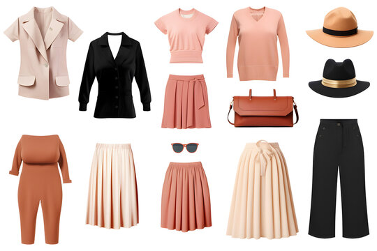 Treny women's fashion clothes collection isolated. Female clothing on white. Beautiful apparel set.
