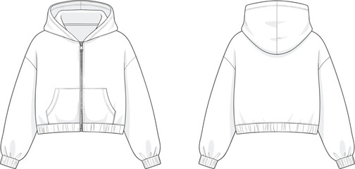 Cropped zip hoodie vector illustration, fashion flat template, front and back technical drawing apparel outline mockup