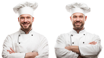 Realistic chef wear and toque hats, vector 3d cook uniform. Black and white restaurant chef kitchen aprons, jacket and pants suits, hats and bandana. Restaurant staff wear, baker and butcher uniform