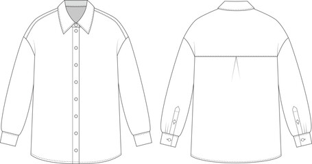 Editable technical flat of a loose long-sleeve button-up shirt with classic collar, back yoke with box pleat, and buttoned cuffs. Front, back view. For fashion design, tech packs, and production.