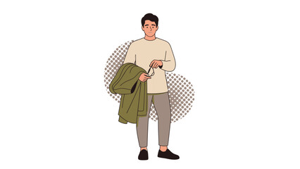 Casual young man holding a green jacket and standing against a dotted background in a modern