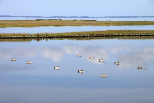 Chasse aux canards avec hutte et appelants a la conque de l'etang de Thau a Meze - Herault - Occitanie