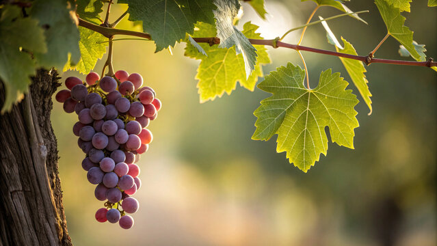 Ripe purple grapes hanging from vine in golden sunlight, autumn vineyard scene with glowing leaves and bokeh