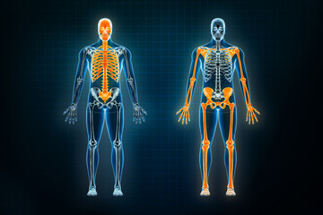 Axial and appendicular skeletal system x-ray front or anterior view. Osteology of the human skeleton 3D rendering illustration. Anatomy, medical, science, biology, healthcare concepts.