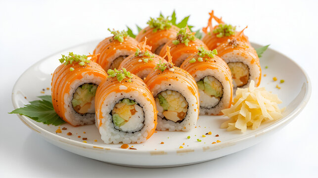 a plate of fresh sushi rolls with wasabi and ginger on a white isolated background, fresh and appetizing look