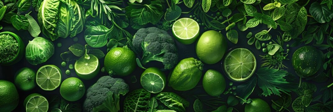 Green Fruits and Vegetables Banner for Your Healthy Vegan Diet! Fresh and Seasonal Herbs Loaded with Vitamins