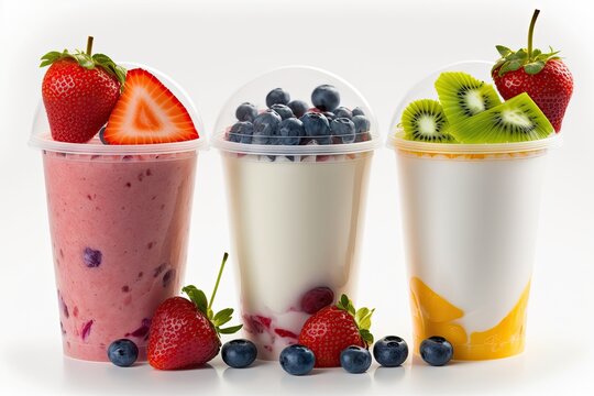three colorful smoothies with fresh fruit toppings in clear cups. Generative AI