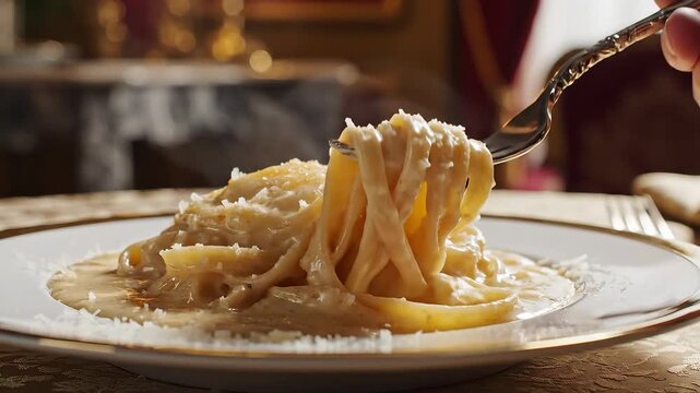 A closeup shot captures a fork expertly twirling and lifting delicious creamy pasta from a beautifully set plate highlighting the rich texture and appetizing appeal of a gourmet Italian meal served i.