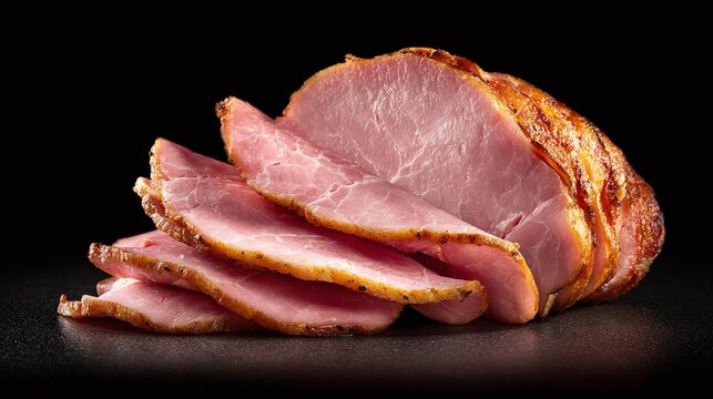 Slices of appetizing cooked meat with a tender pink hue, sitting on a dark surface. The meat's edges are tinged with a golden-brown crust, enhancing its visual appeal and texture.