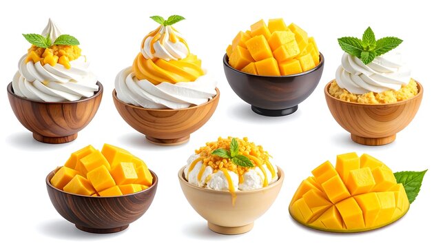 Assortment of desserts featuring creamy swirls, fresh mango chunks, and mint sprigs in wooden bowls, on a plain white background