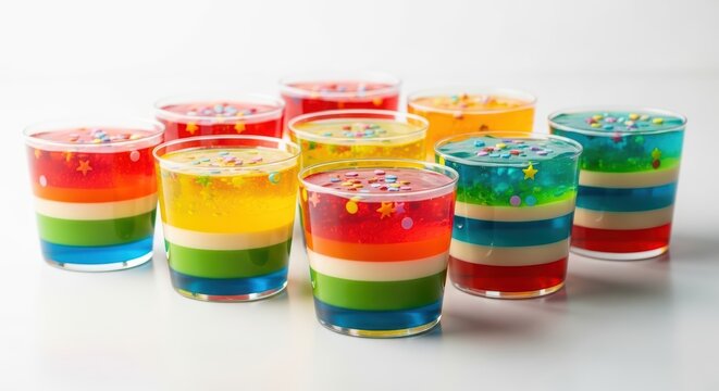 Colorful rainbow layered jello desserts with sprinkles on white background