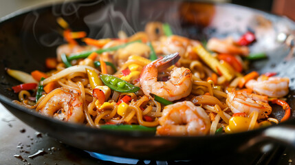 Close-up of wok-fried noodles, vegetables and shrimps arranged on the table. Intense colors and aromatic ingredients create an appetizing composition.