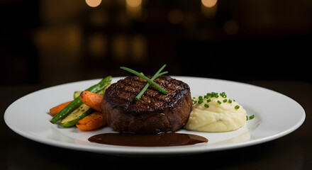 gourmet food photography, high-end steak dish presentation with dramatic lighting and black background, reminiscent of michelin-star dining