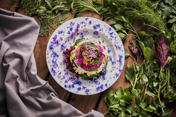 dish featuring a grilled salmon fillet, garnished with a fresh herb salad and a tangy lemon